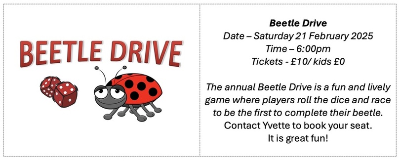 Join us for our scheduled events throughout the year! Further details will be provided as we near each occasion so please keep a look out on the Village Hall WhatsApp. Additional events may be organised by our wonderful residents, details of these will be issued at the earliest opportunity. Any questions please do not hesitate to contact a Trustee of the hall, we look forward to seeing you soon, from your Trustees, Andy Bastow, Sue Sturdy, Ben Marsh, Mark Kvesic, Renee Fowler-Norris and Yvette Williams Hardy.